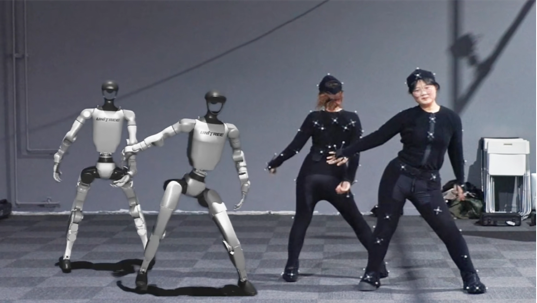 - 高精度数据采集训练系统,将捕捉到的人体长序列复杂动作,精准映射至机器人URDF模型,再通过深度学习算法优化运动轨迹与关节角度解算。在这一过程中,我们采用“模仿学习引导 + 强化学习优化”的先进框架训练机器人运动小脑,有效突破了长序列动作的泛化性限制。通过仿真训练结合监督微调,最终让机器人实现“站稳不摔跤、动作更类人”的敏捷运动能力,并成功部署至真机验证。